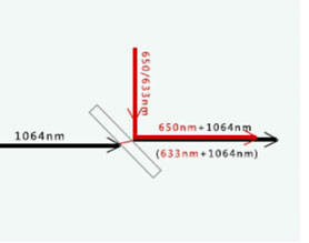 YAG合束镜主要应用在利用激光二极管做校准的系统中。YAG合束镜设计用于 45度入射时,传输1064nm激光束,并利用90度反射的二极管激光光束来校准它。